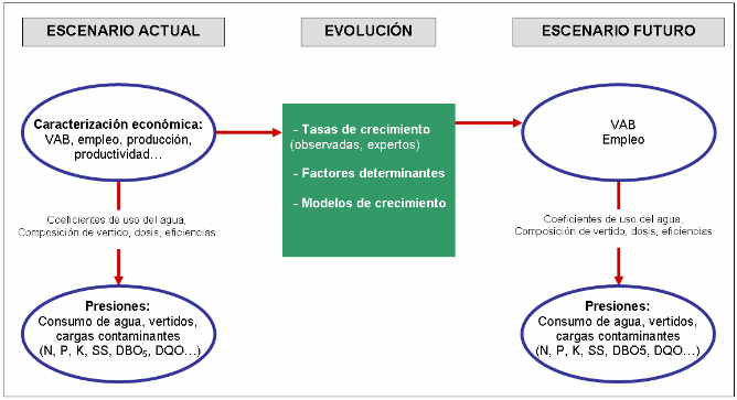 Caracterización económica del uso del agua y análisis de tendencias.Los usos del agua que se han considerado son los siguientes: abastecimiento a la población residente, turismo, usos recreativos, agricultura, ganadería, industria, energía, transporte marítimo, pesca y acuicultura.Se establece el análisis de variables económicas como el empleo, el valor añadido bruto (VAB) y análisis de presiones cuantitativas como el consumo de agua según usos, y presiones químicas como el volumen de vertidos y dosis brutas de nitrógeno, fósforo y potasio generadas por los diferentes usos.El análisis de las presiones se aborda en un escenario base (2002-2004) y sus tendencias al año 2015.