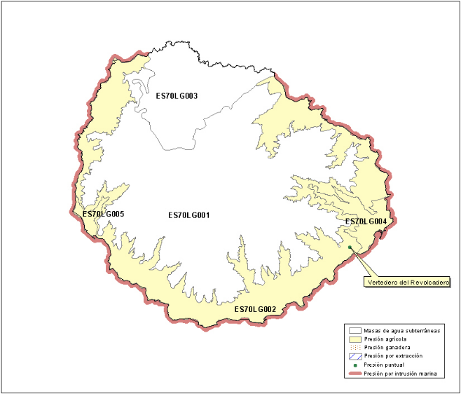 El estado químico del agua subterránea puede caracterizarse mediante numerosas variables, con el fin de acotar los parámetros a analizar y que las redes de control resulten operativas, se han seleccionado las presiones que principalmente afectan a la calidad de las aguas subterráneas de las islas. En el capítulo de los programas de seguimiento del estado químico se detalla los cambios en el tiempo de cada presión, así como las características especiales de las redes de control de las mismas.